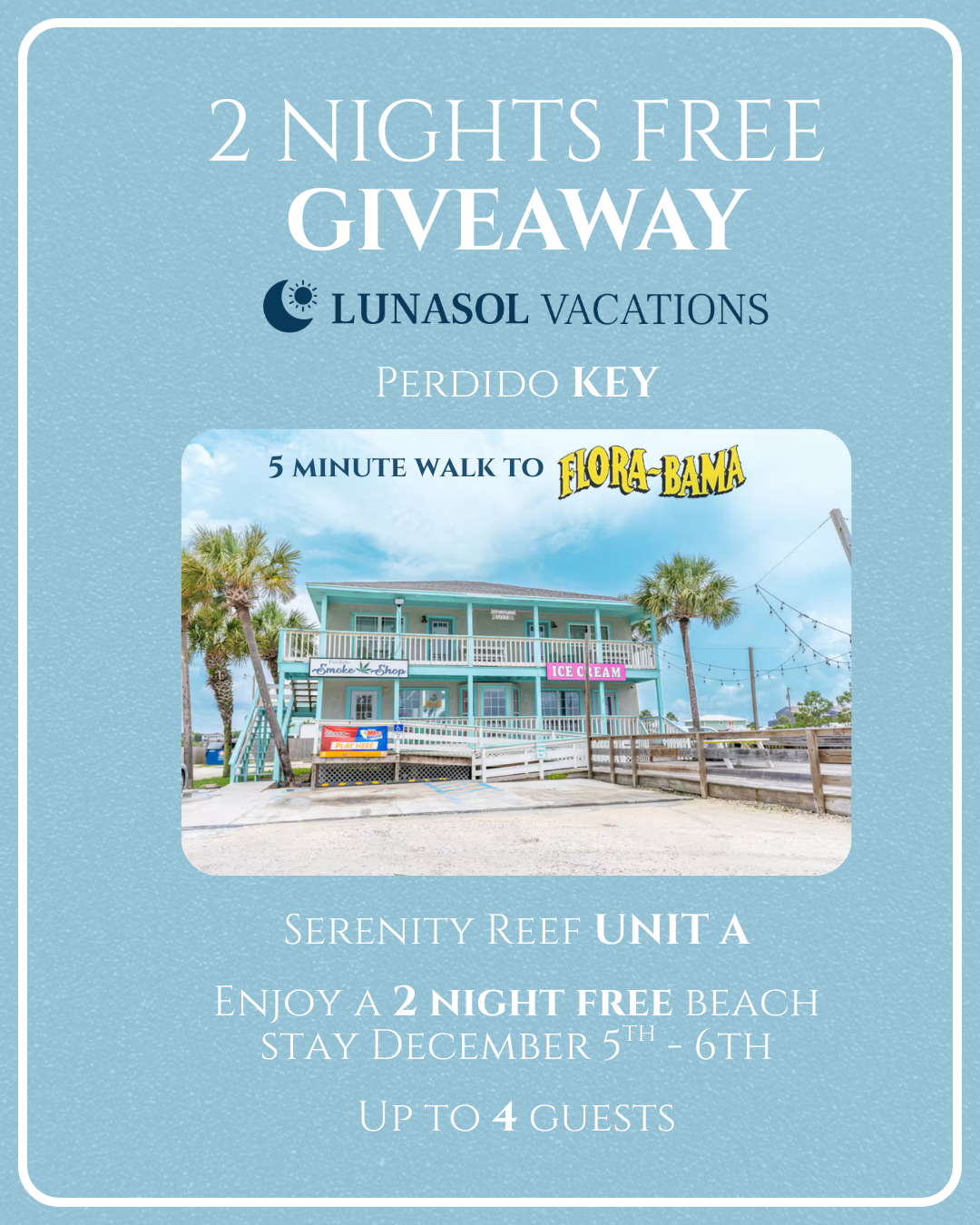 Giveaway don’t miss your chance to win a free 2-night stay at Serenity Reef A in beautiful Perdido Key, FL! LunaSol Vacations is giving away a relaxing beach getaway for up to 4 guests—lodging included, no purchase necessary. To enter, follow a few simple steps on Instagram and attend Run, Roast, & Refresh at Portside Pickle. Winner announced live! Full terms and conditions apply. Enter now and start dreaming of the beach.